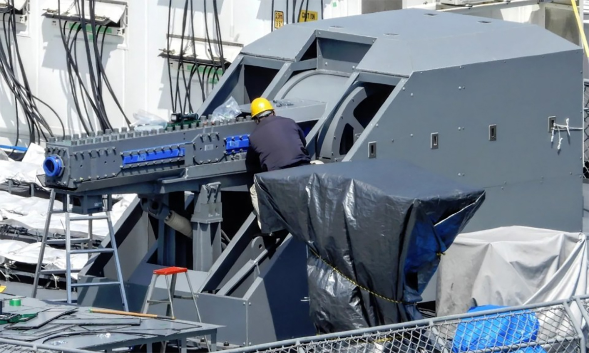 Technicians installing the prototype railgun on the JS Asuka. Photo: X/hnlehupy4nr6hrm |