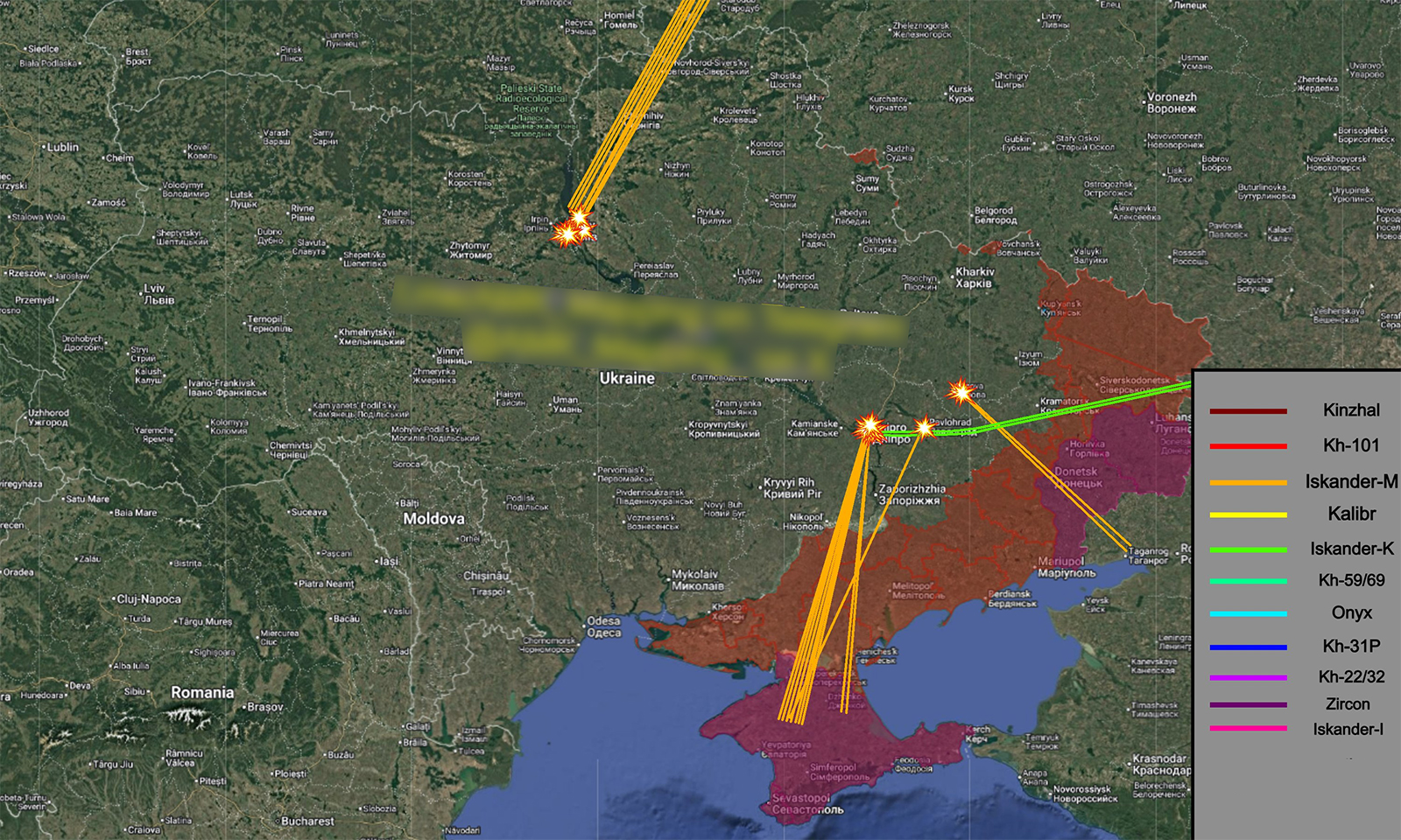 Ukraine's Air Force Command announced today that Russia attacked the country with 24 Iskander-M ballistic missiles and modified S-300 anti-aircraft missiles, one Kh-59/69 tactical cruise missile, and 219 unmanned aerial vehicles (UAVs) of various types. The primary targets were the capital Kiev and major cities including Kharkov, Odessa, and Dnipro.