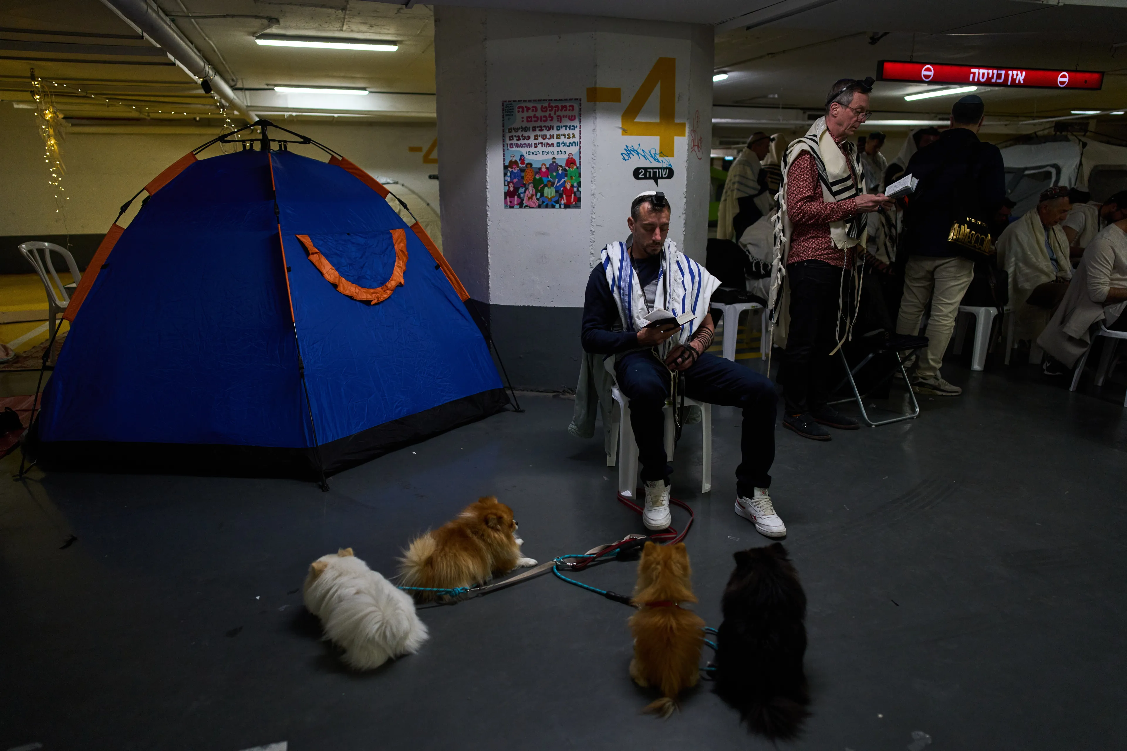 Tents, mattresses, rugs, and children's toys occupy a corner of an underground parking lot in Tel Aviv on 12/3.