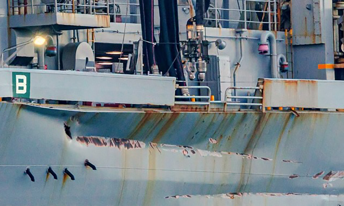 Damage to the hull of the USNS Supply in a photo released on 13/2. Photo: Instagram/Tessaron News 3 |