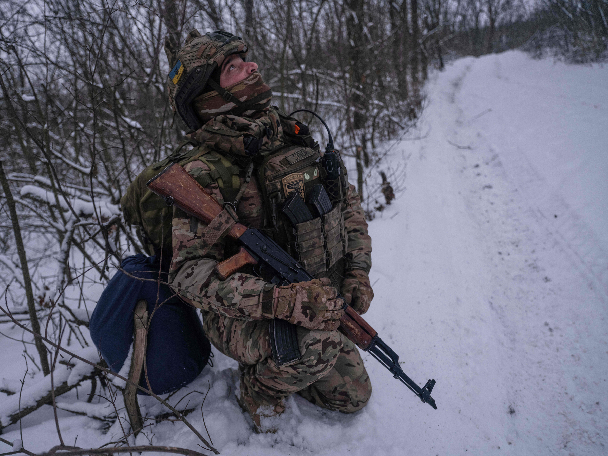 Ukrainian soldiers observe unmanned aerial vehicles in the sky over Donetsk, Ukraine, on 30/12. Photo: AP