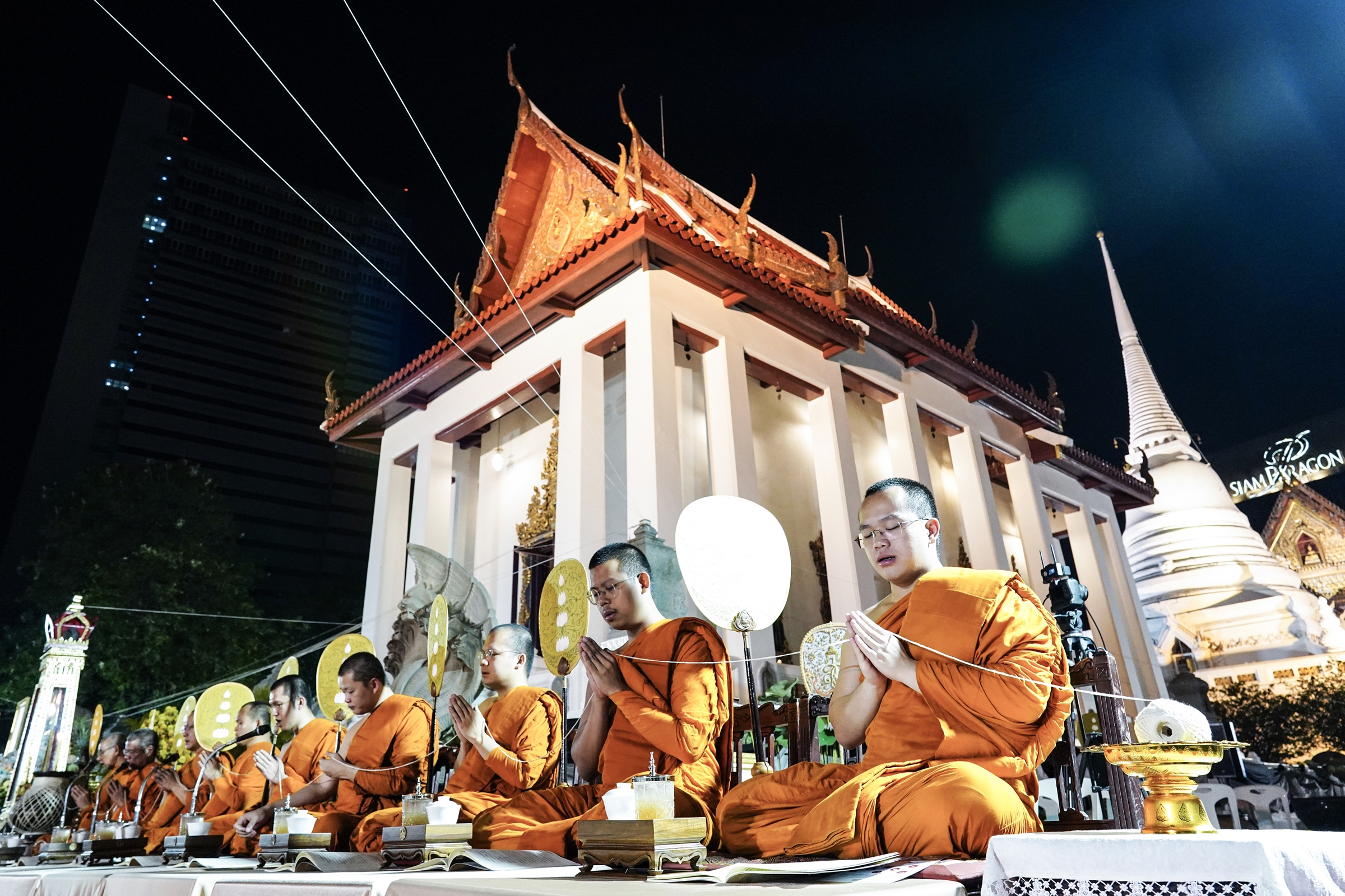 Prayers for a peaceful new year at Wat Pathum Wanaram temple in Bangkok, Thailand.