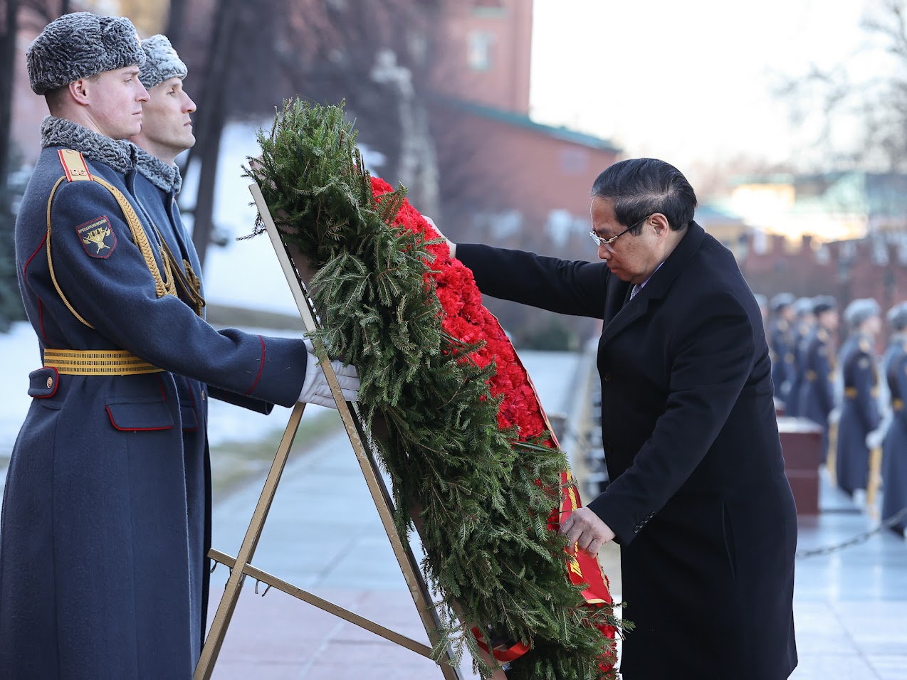 Prime Minister Pham Minh Chinh lays flowers at the Tomb of the Unknown Soldier in Moscow. Photo: VGP |