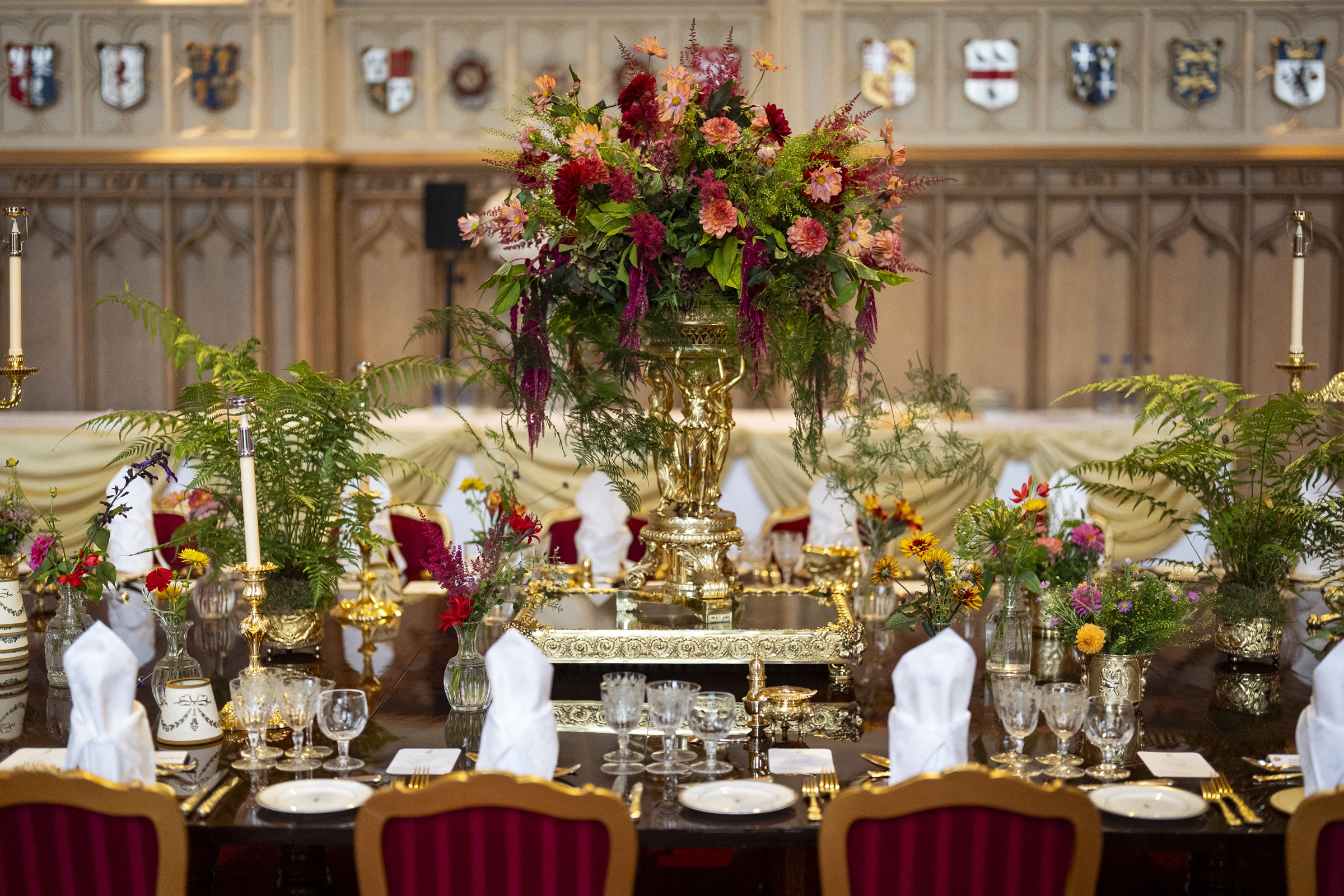 The banquet table was decorated with pink, purple, and gold flowers picked from the gardens of Windsor Castle and Windsor Great Park. After the banquet, the flowers are typically donated to Floral Angles, a charity championed by Queen Camilla, for distribution to care centers and nursing homes.