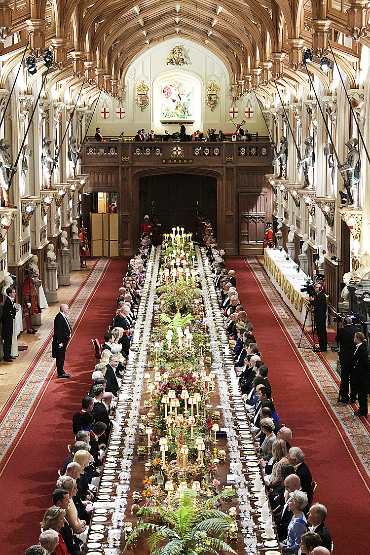 St. George's Hall is the largest room in Windsor Castle, measuring 55.5 m long and 9 m wide. Staff began arranging the 50 m long Waterloo table, made of mahogany, in St. George's Hall a week prior.