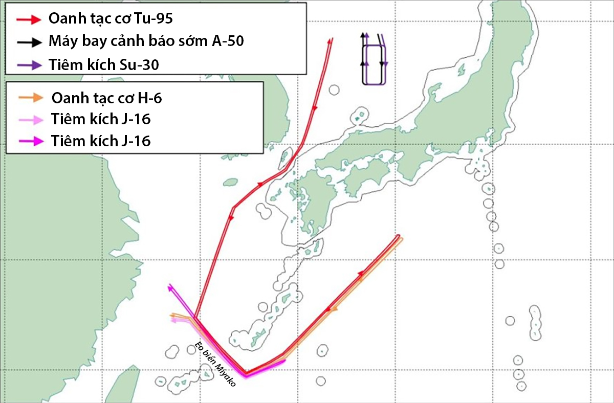Upon reaching the area west of the Miyako Strait, the Russian formation linked up with two Chinese H-6 bombers and 8 J-16 fighters. They then flew through the area, turning northeast. 4 J-16 aircraft later returned, while the remaining planes continued further before circling back along the same route.