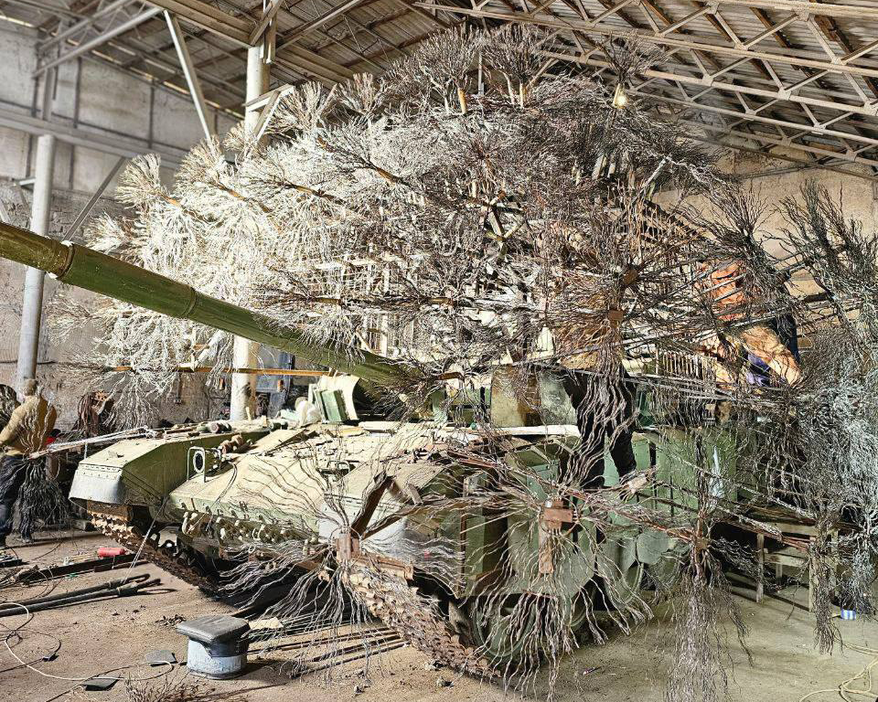 Images posted on social media last weekend show a Russian T-90M main battle tank inside a warehouse, surrounded by metal bundles welded onto a steel frame, forming a structure resembling a dandelion flower. The gaps are also covered with heavy-duty steel mesh.