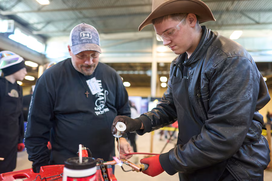 Daniel Friesen, 16, carefully held a blowtorch in one hand to solder copper pipes, under the guidance of an HVAC technician. "I like working with metal. I enjoy hands-on work. After graduation, I want to pursue a career in construction," Friesen stated.