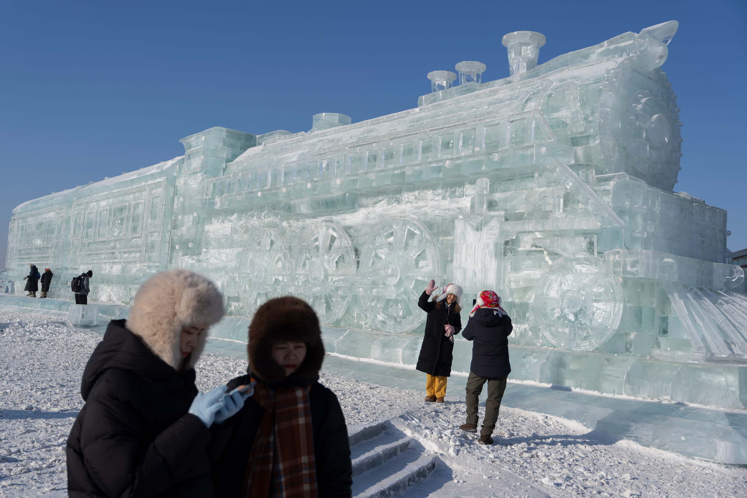 Tourists pose in front of an ice sculpture of a train.
