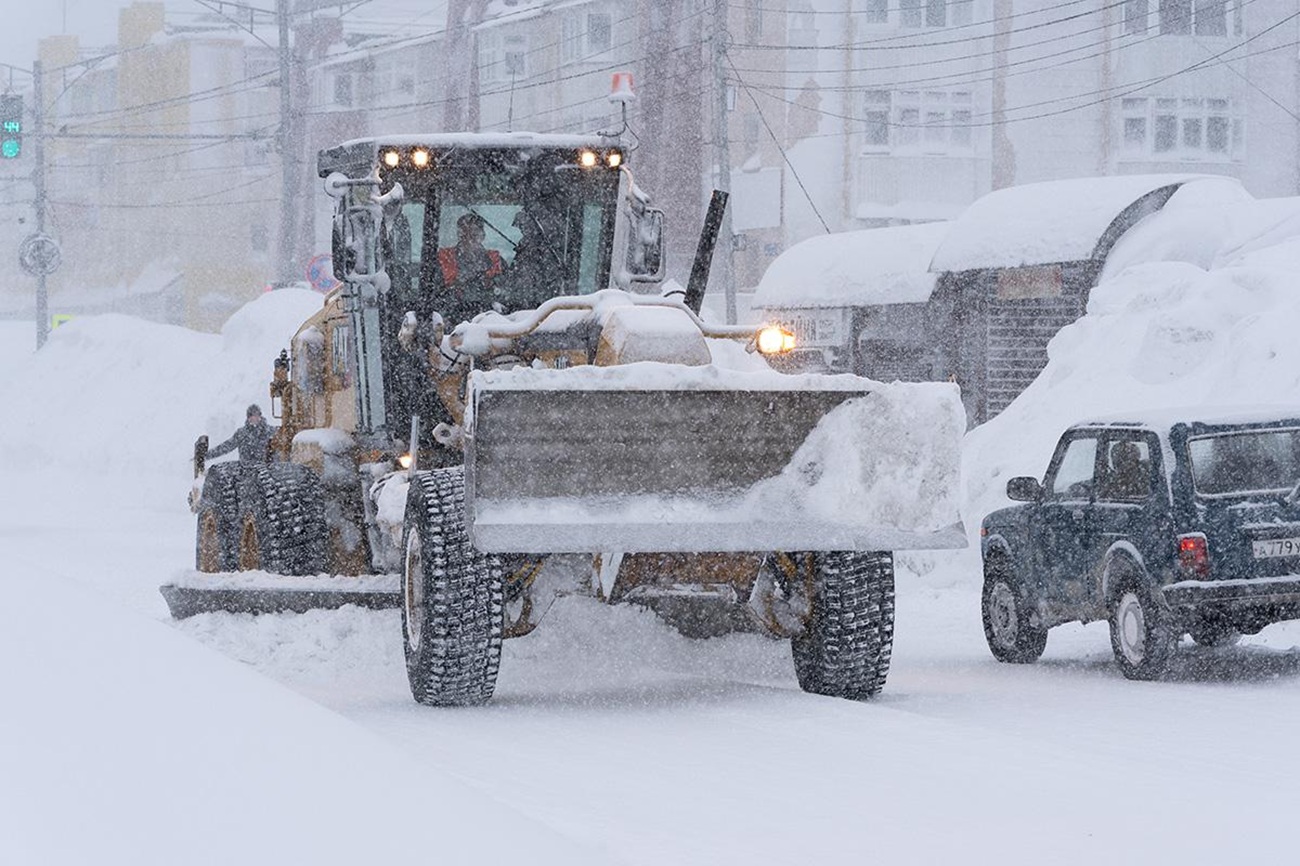 Snow plows operate during snowfall in Petropavlovsk-Kamchatsky on 15/1. Visibility in the area was at times reduced to zero due to the blizzard.