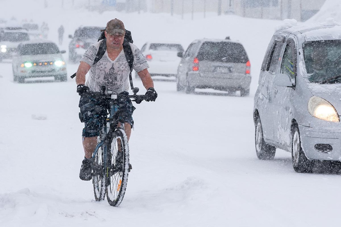 A man in summer clothes cycles through the heavy snowfall in Petropavlovsk-Kamchatsky.