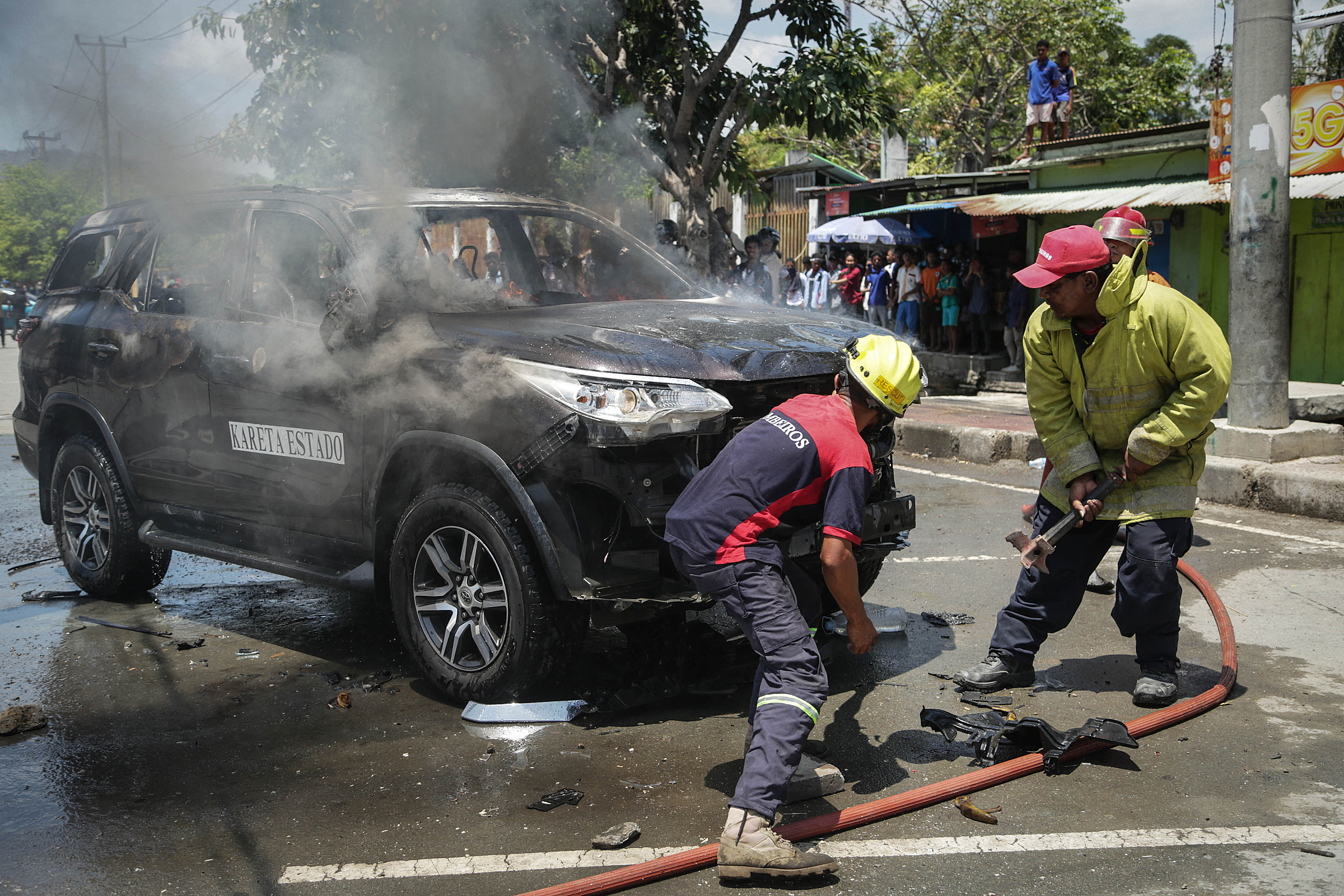 An official vehicle burns during student protests in Dili on 16/9. Photo: AFP |