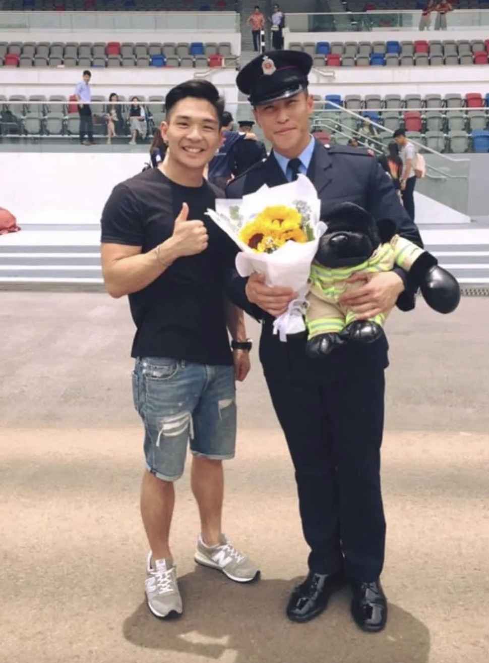 Ho Wai Ho (right) with a friend at his fire academy graduation. *Photo: Threads/tracylam923* |