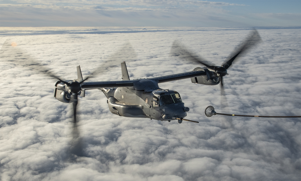 A US CV-22B tiltrotor aircraft refuels from an MC-130J aircraft during an exercise in Sweden in 11/2020. Photo: USAF |