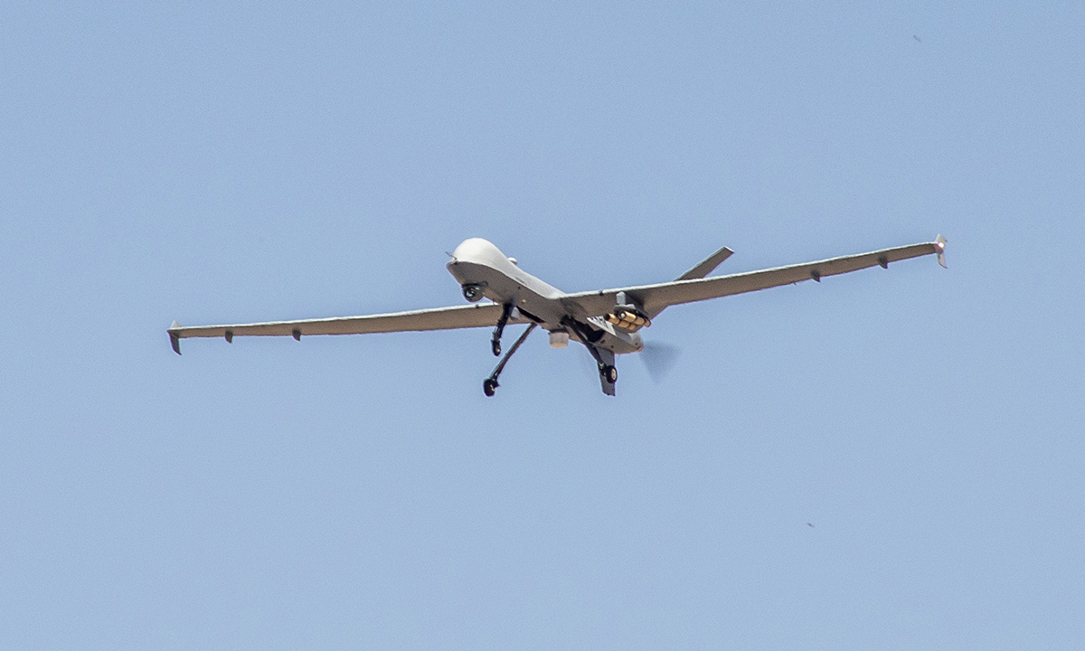 An MQ-9 Reaper unmanned aerial vehicle during a test flight at the Yuma proving ground, Arizona, US on 22/7. Photo: US Army