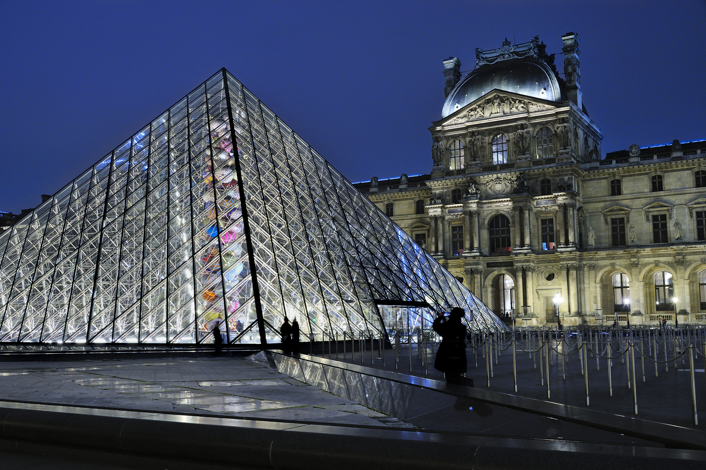 The glass pyramid, an iconic architectural feature of the Louvre museum, illuminated on 2/12. Photo: AFP |