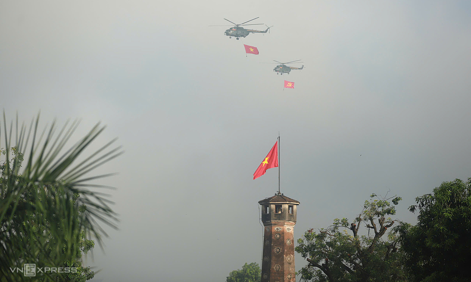 Helicopters fly near the Hanoi Flag Tower on 2/9. Photo: Vo Thanh